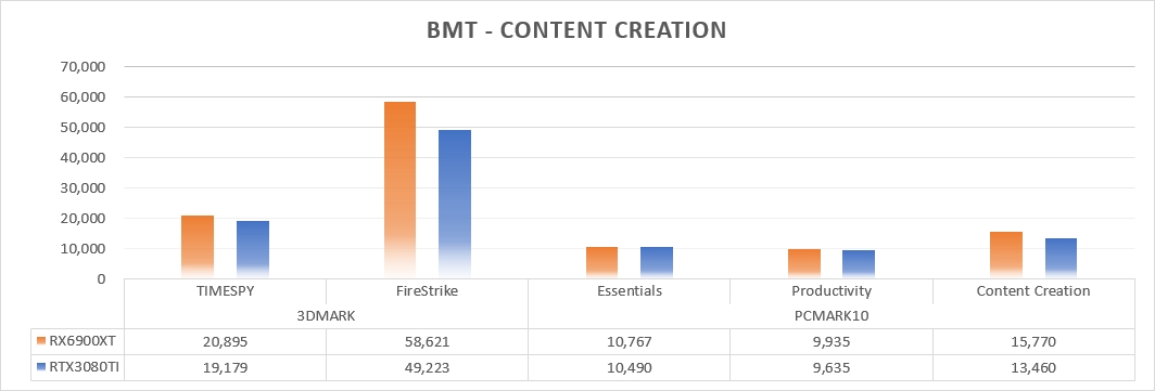 결정적으로 콘텐츠 제작에 사용하는 프로그램에서도 마찬가지 결과를 보였다. 다만 저조한 차이에 불과했기에 콘텐츠 제작이라면 두 제품 중 어느 제품을 선택하더라도 무난한 사용성이 담보된다. 그럼에도 200만 원이 넘는 고가 그래픽카드를 가지고 게임한 번 즐기지 않을 거라고 단호히 예단할 수는 없기에 다방면에 사용할 목적이라면 이러한 조건에서도 답은 라데온이 더 나은 선택이 될 수 있다.