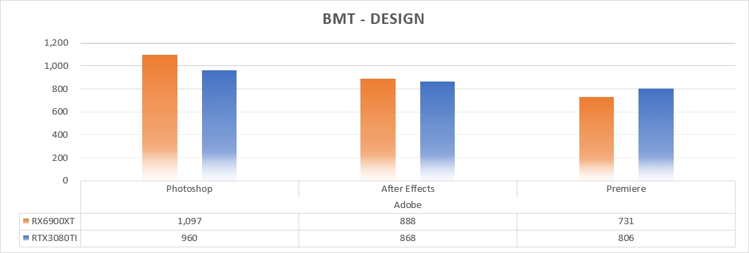 결정적으로 콘텐츠 제작에 사용하는 프로그램에서도 마찬가지 결과를 보였다. 다만 저조한 차이에 불과했기에 콘텐츠 제작이라면 두 제품 중 어느 제품을 선택하더라도 무난한 사용성이 담보된다. 그럼에도 200만 원이 넘는 고가 그래픽카드를 가지고 게임한 번 즐기지 않을 거라고 단호히 예단할 수는 없기에 다방면에 사용할 목적이라면 이러한 조건에서도 답은 라데온이 더 나은 선택이 될 수 있다.